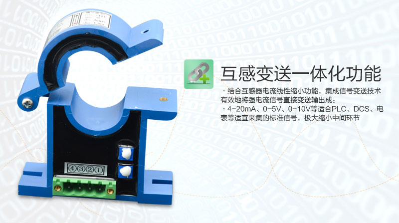 互感變送一體化功能,結(jié)合互感器電流線性縮小功能,集成信號變送技術(shù)有效地將強電流信號直接變送輸出4-20ma、0-5V、0-10V等適合PLC、DCS、電表等適宜采集的標準信號,極大縮小中間環(huán)節(jié)